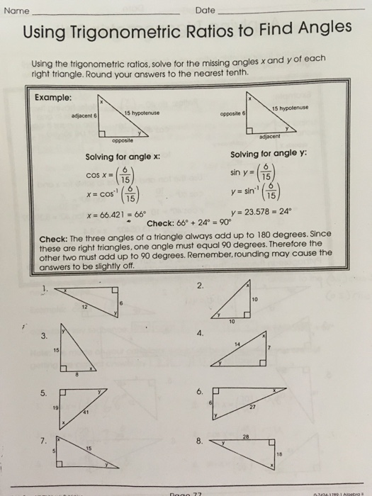 Trigonometry Finding Angles Worksheet Teaching Resources from dryuc24b85zbr.cloudfront.net A right triangle is a triangle that has 90 degrees as one of its angles. Step 2 use sohcahtoa to decide which one of sine, cosine or tangent to use in this question. Tan afracab tan afrac2432km2715km tan a08958 now we solve for a by multiplying both sides of the equation by the inverse tangent. How do you find angle given sides? The method is shown with tutorials and worked examples as well as exercises. These are the four steps we need to follow: \(\cos{x} = \frac{a}{h}\) \\cos{x} = \frac{4}{6}\ \(\cos{x} = 0. The goal now is to find an angle whose sine is 0.75.